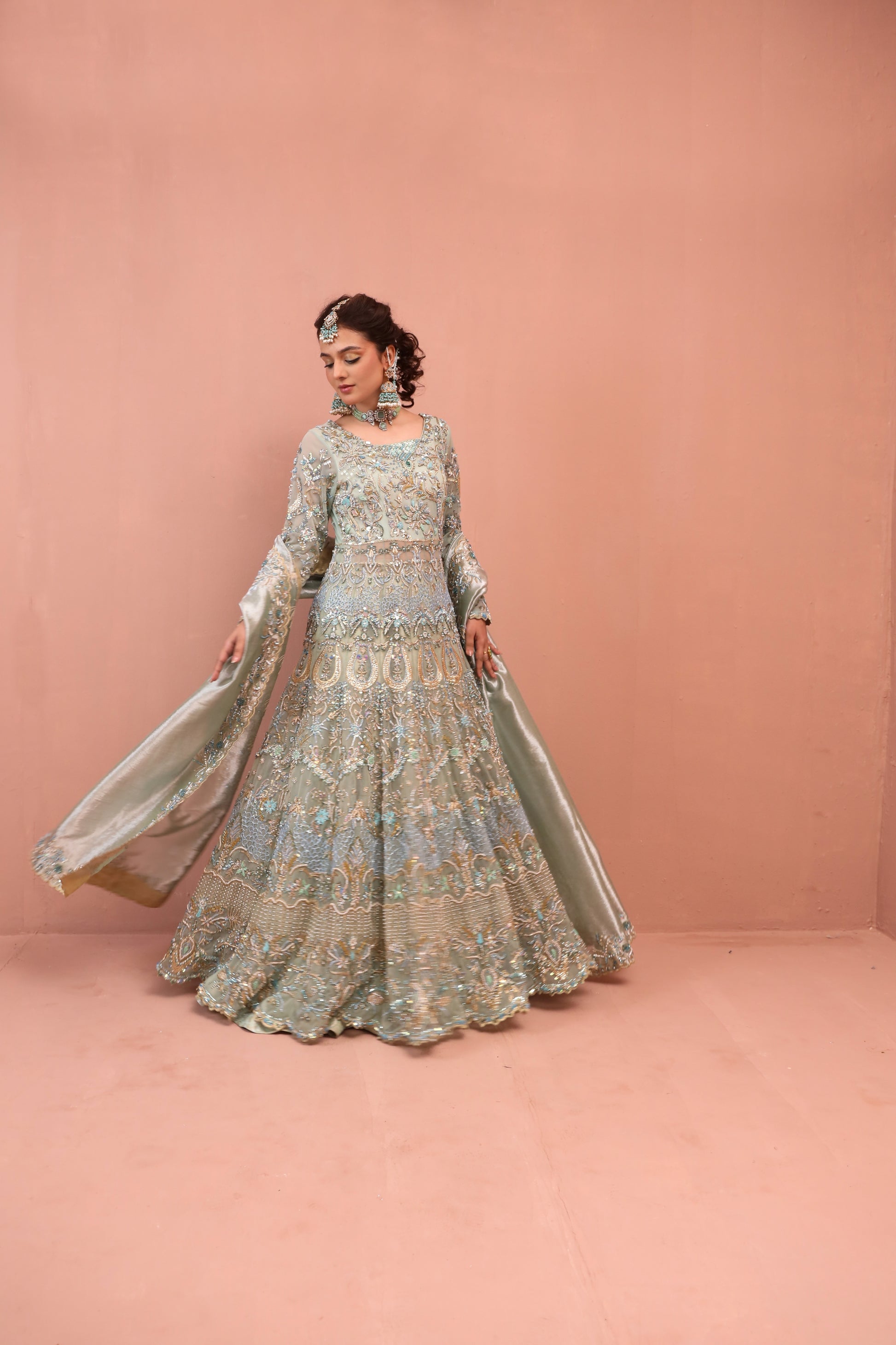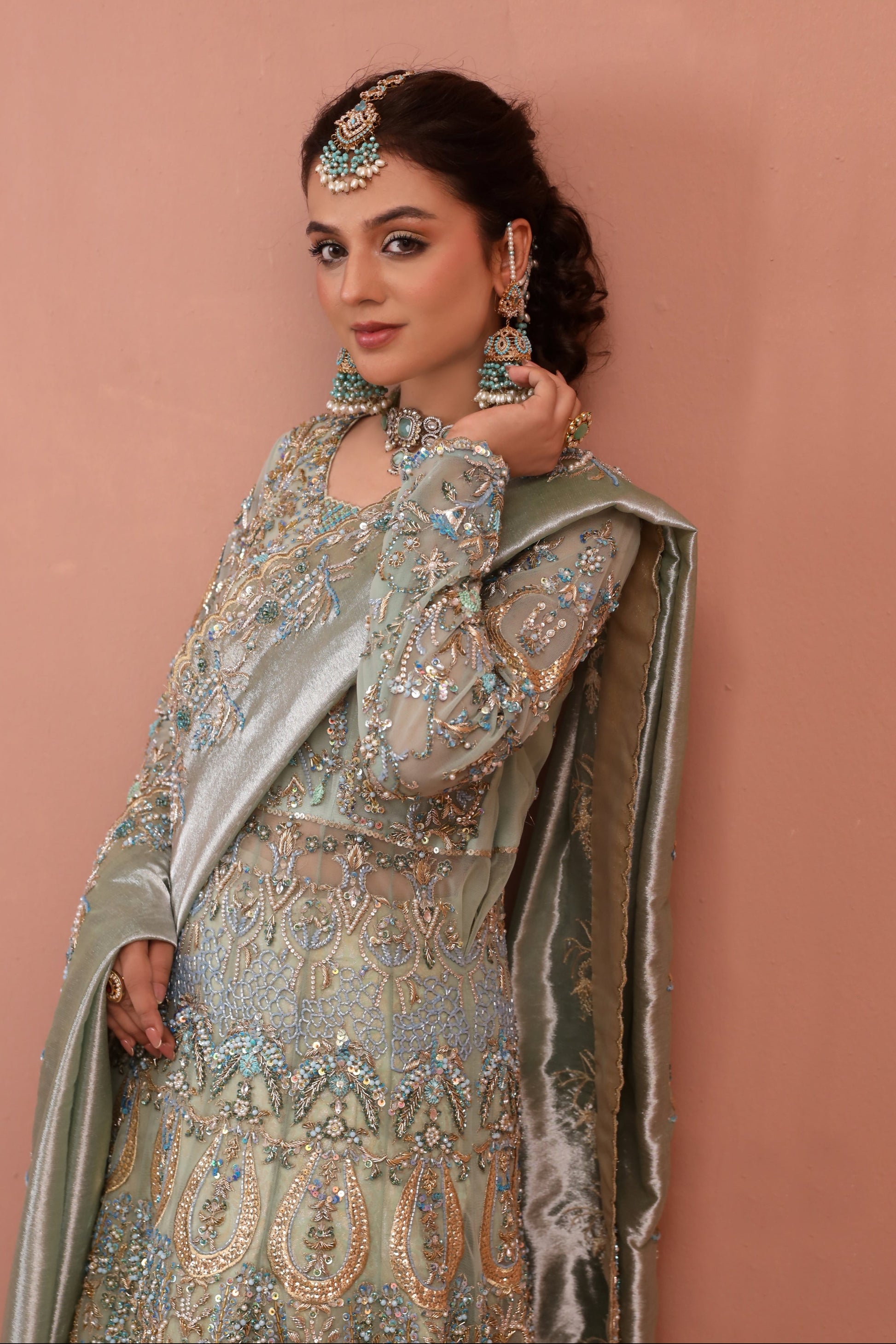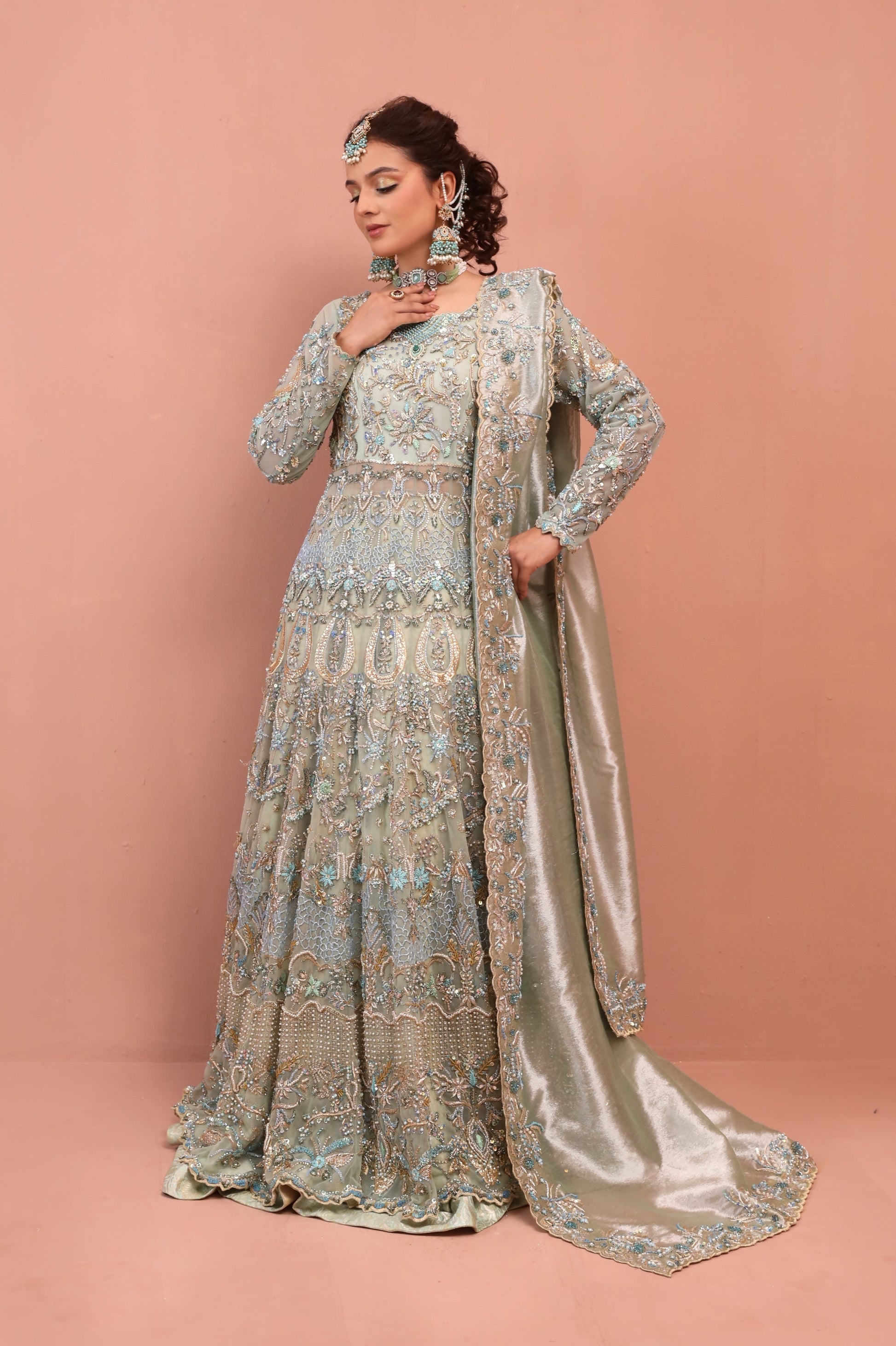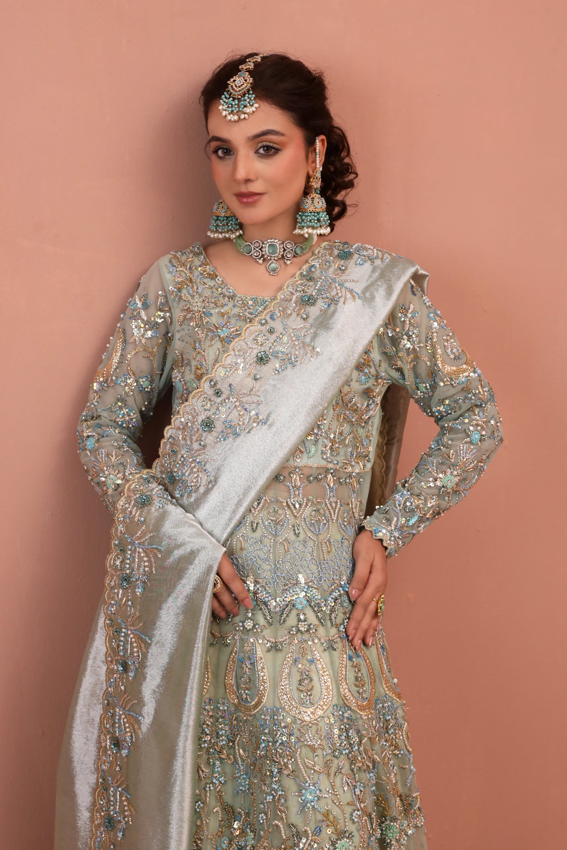 Zarfa is a beautiful bridal outfit that blends elegant tradition with modern style. Featuring sparkling Swarovski crystals, soft pearls, and detailed embroidery on royal net fabric, it includes a luxurious tissue dupatta and a finely woven jamawar lehnga. Designed to make you look and feel unforgettable, Zarfa is the perfect choice to shine with confidence and grace on your special day.