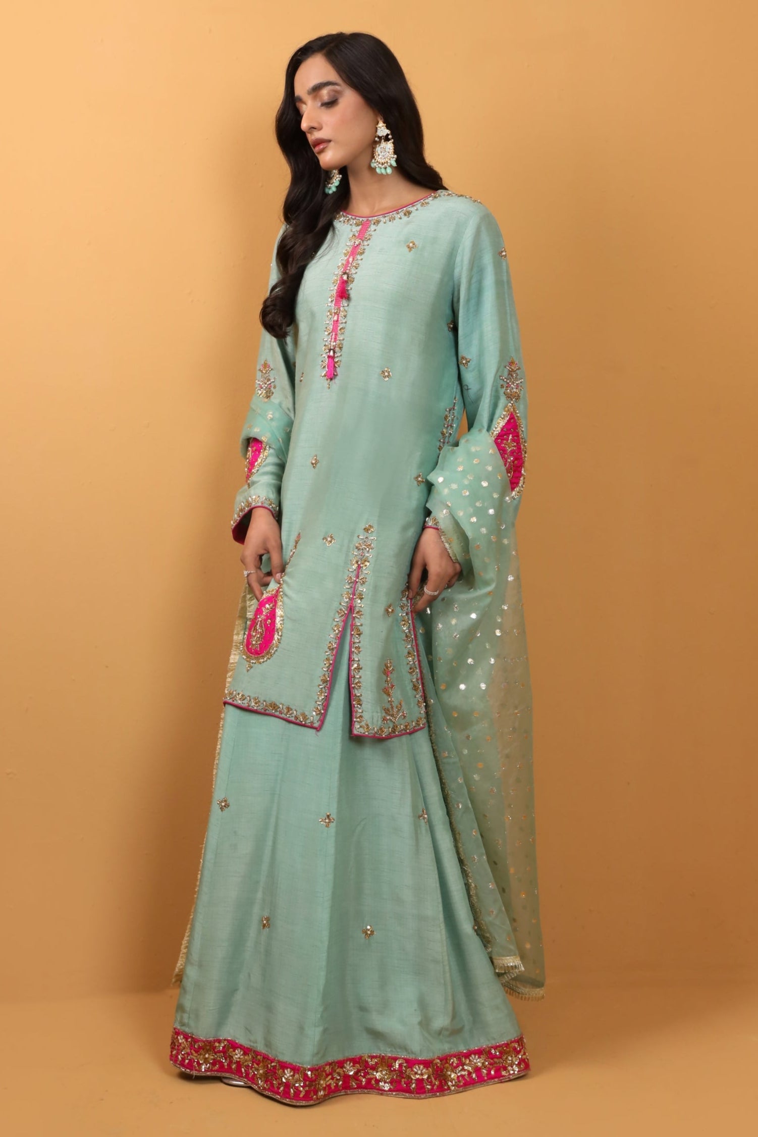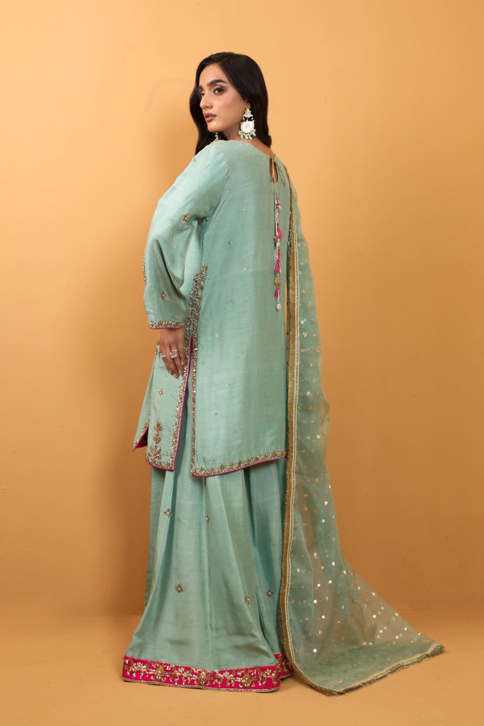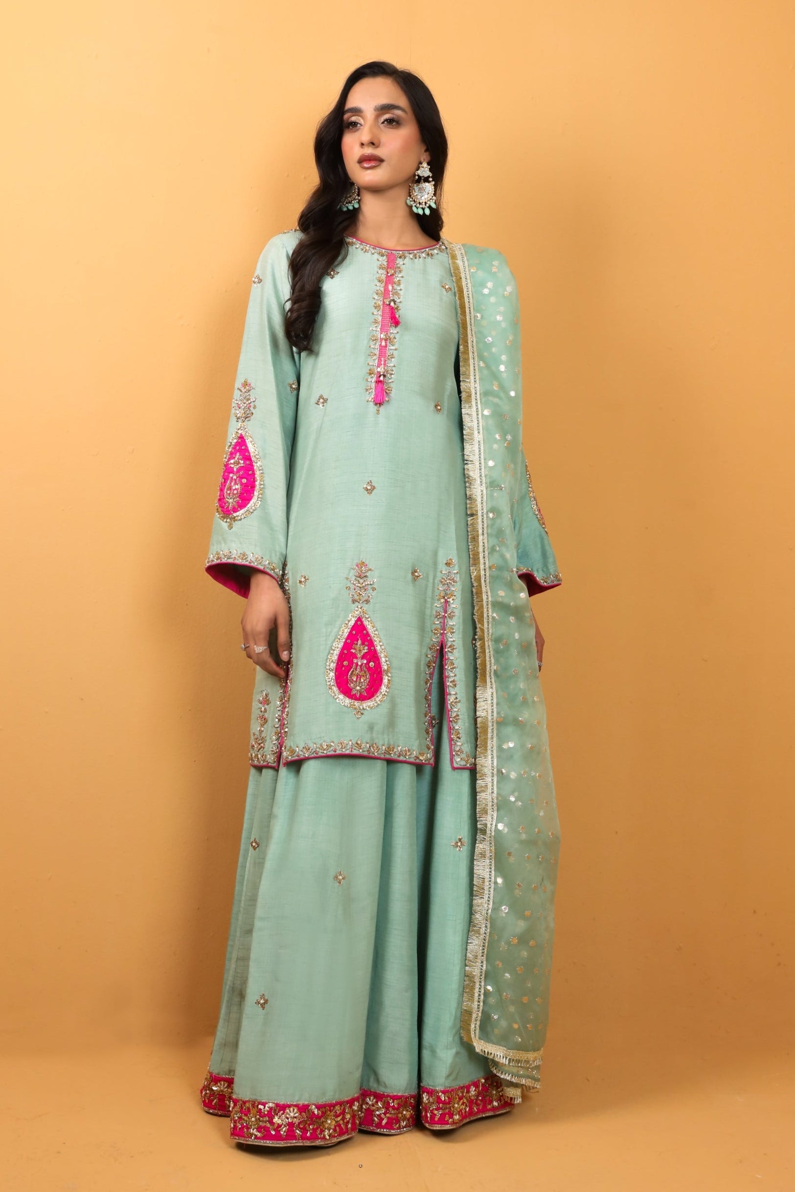 This beautifully crafted ensemble showcases shocking patching, adorned with sequin, Dabke, and pipe work. The classic neckline and borders reflect the designer’s unique style, paired with an embellished Sharara and embellished Organza dupatta, completed with Kiran, imparting a sense of refinement and intricate detail.