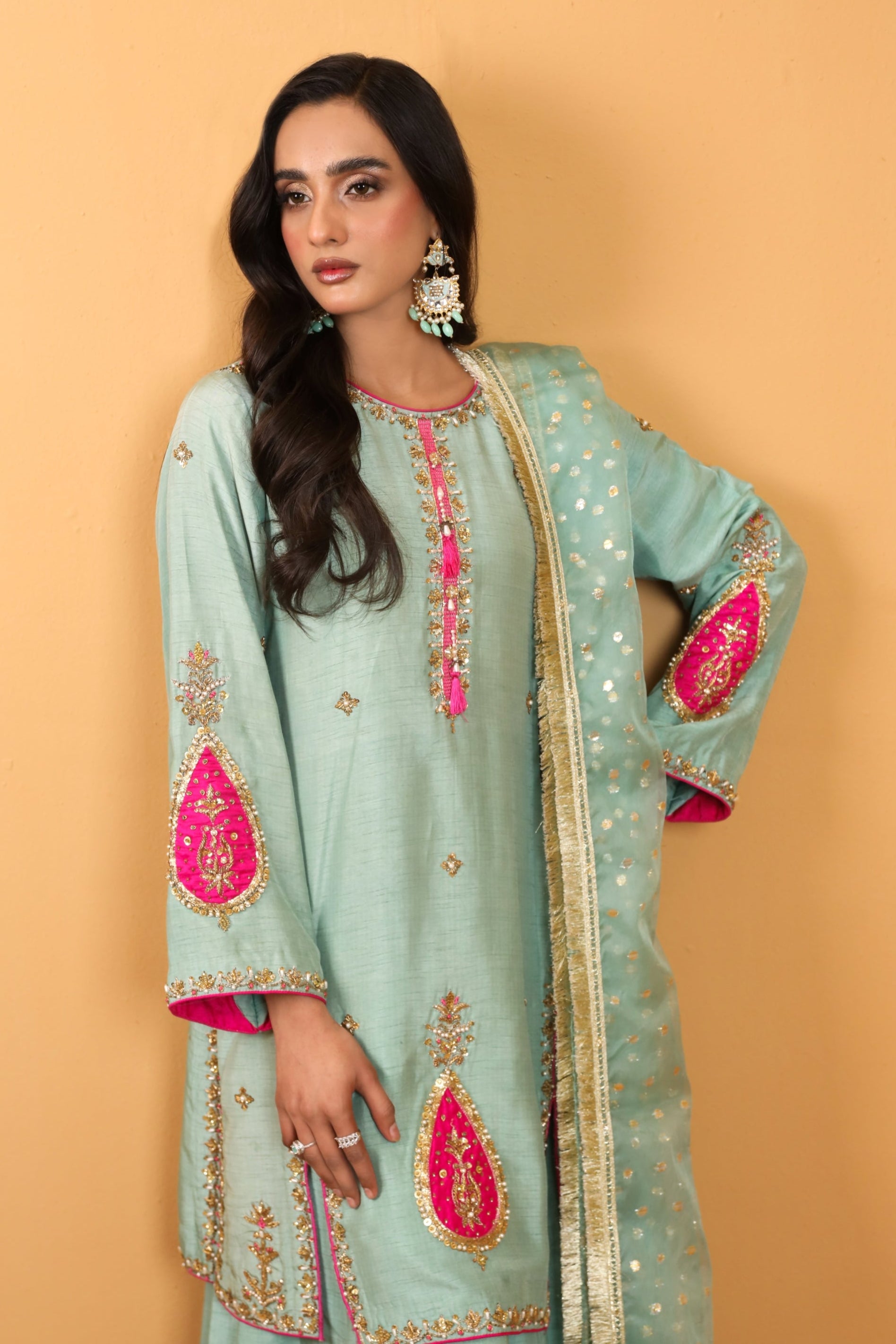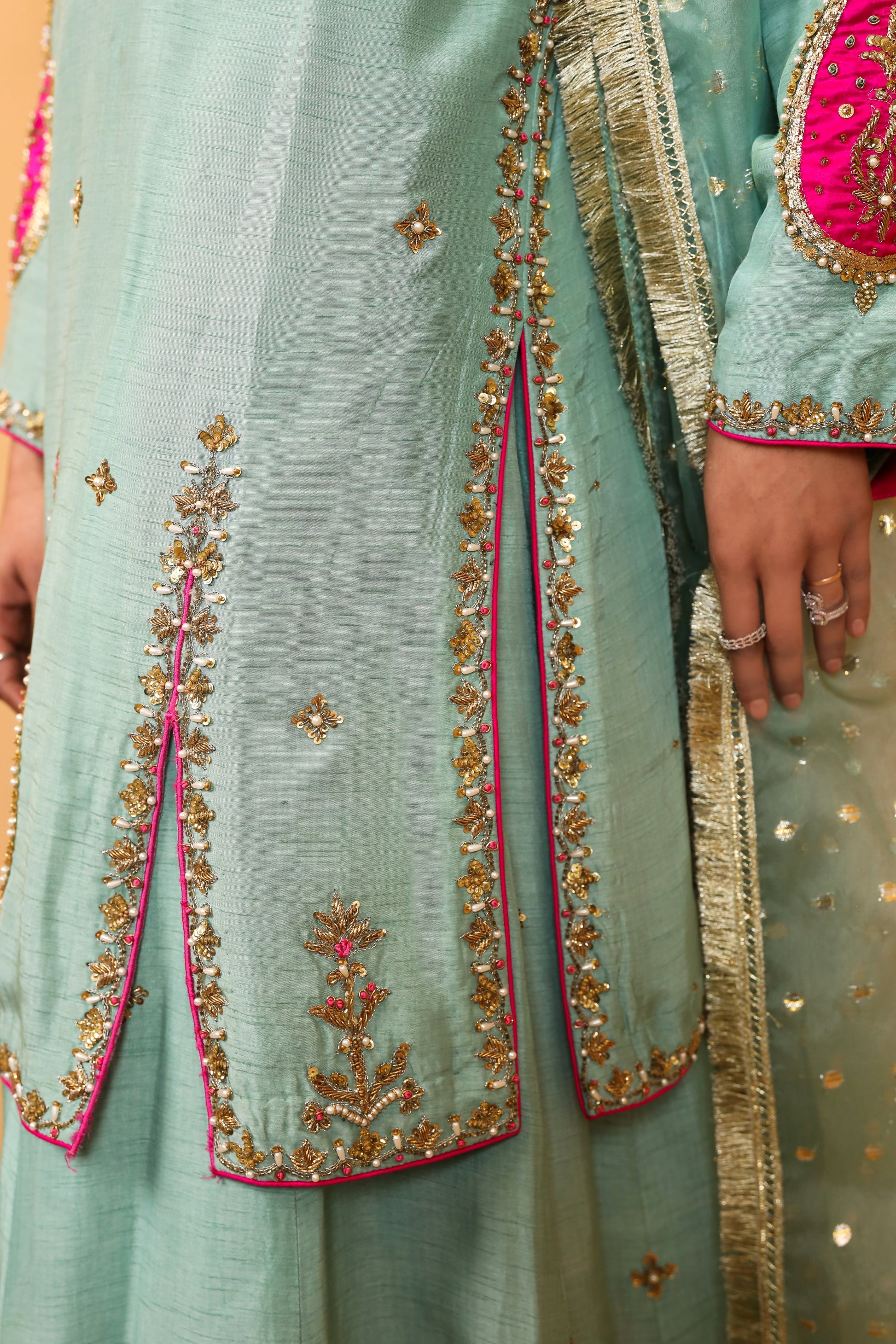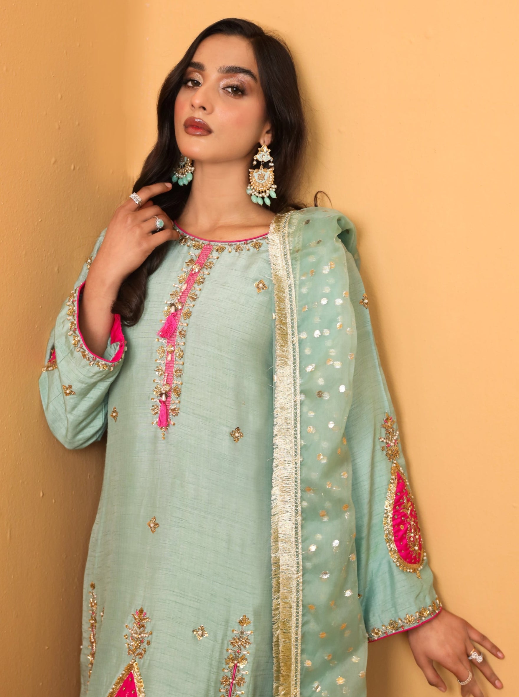 This beautifully crafted ensemble showcases shocking patching, adorned with sequin, Dabke, and pipe work. The classic neckline and borders reflect the designer’s unique style, paired with an embellished Sharara and embellished Organza dupatta, completed with Kiran, imparting a sense of refinement and intricate detail.