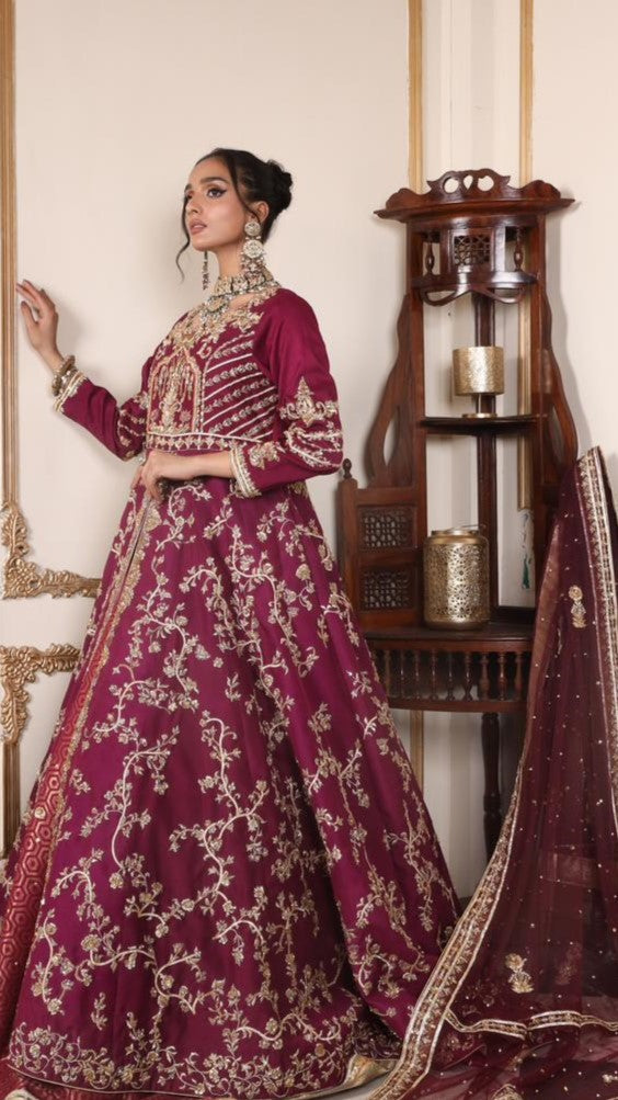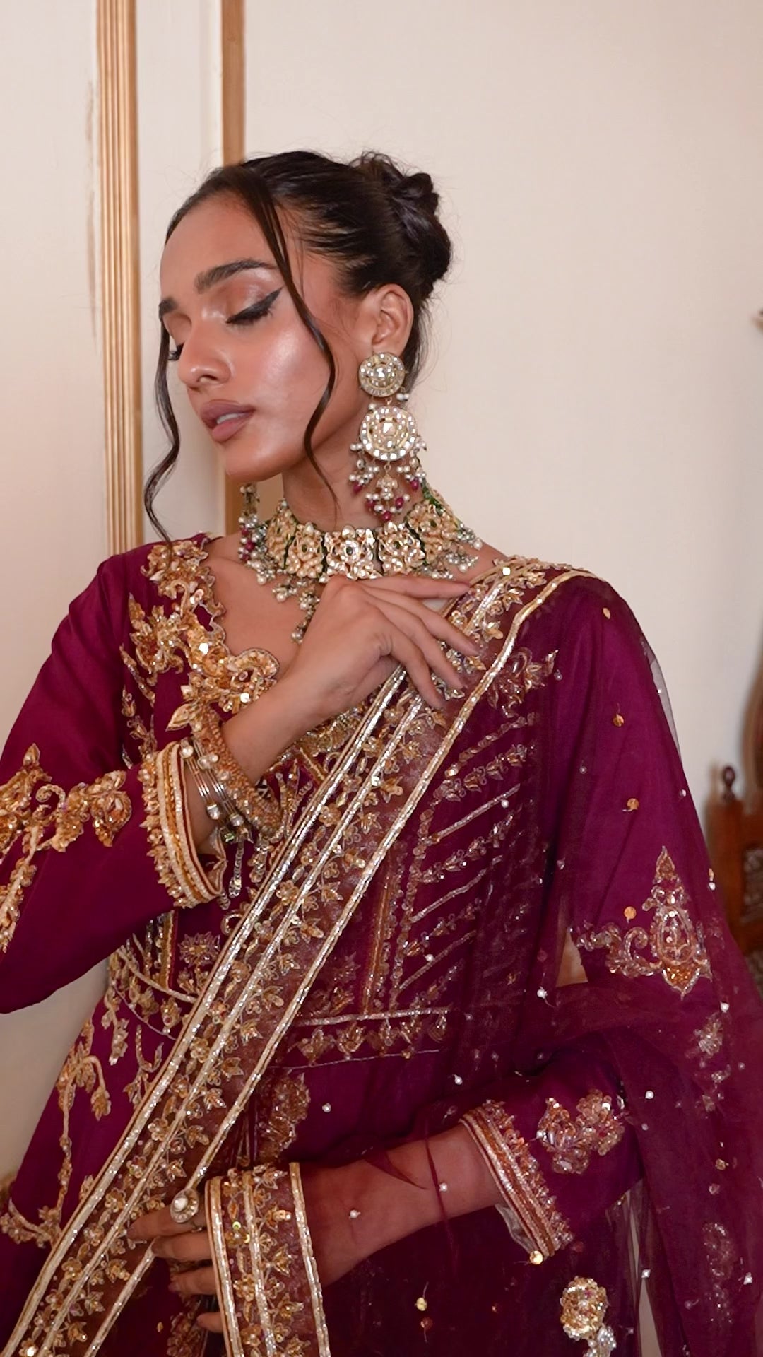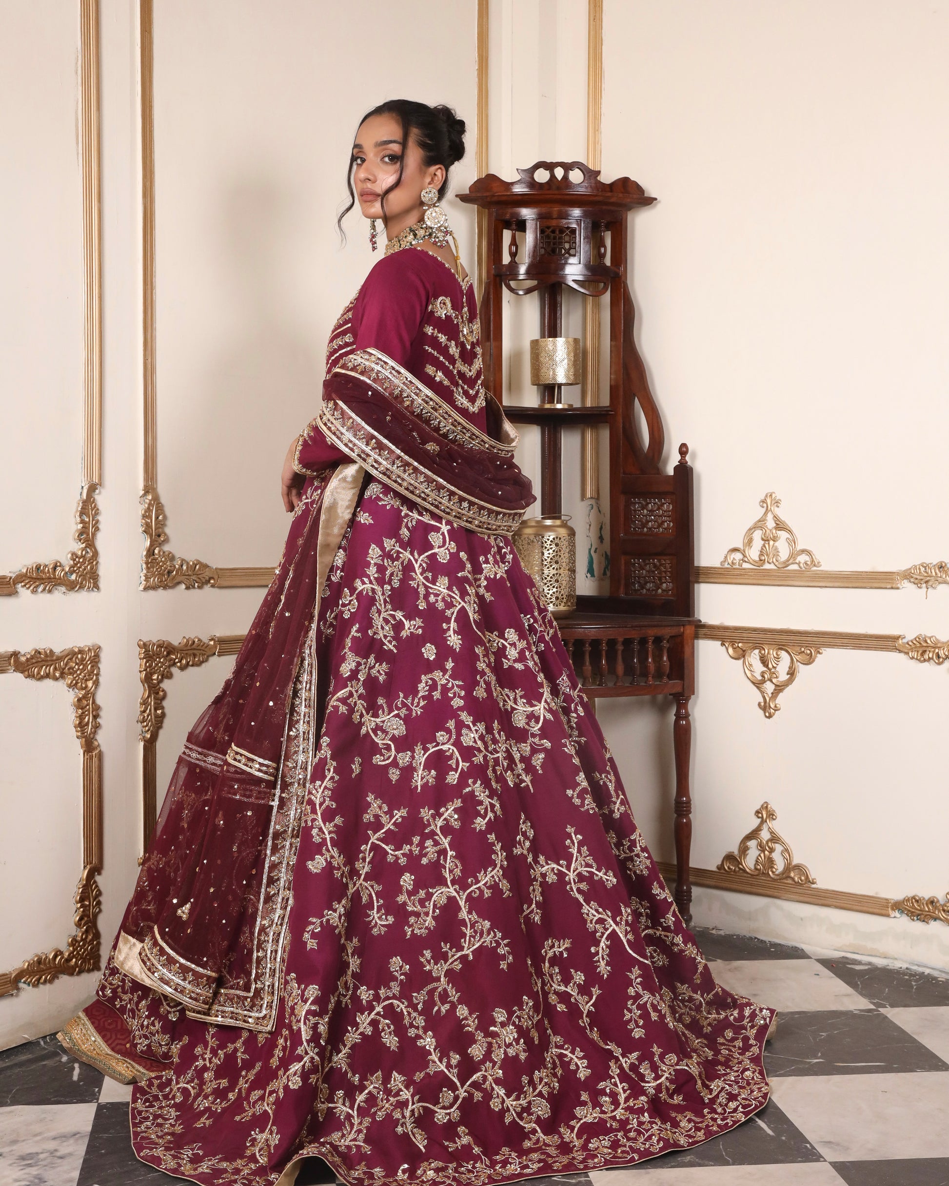 This extravagant bridal Gown has luxe zardoze work in gold reshum, zarri, dubka and stones. It has a heavily worked back as well with a dori tassel on the back neckline. It is paired with a net handmade dupatta worked pallus and borders.