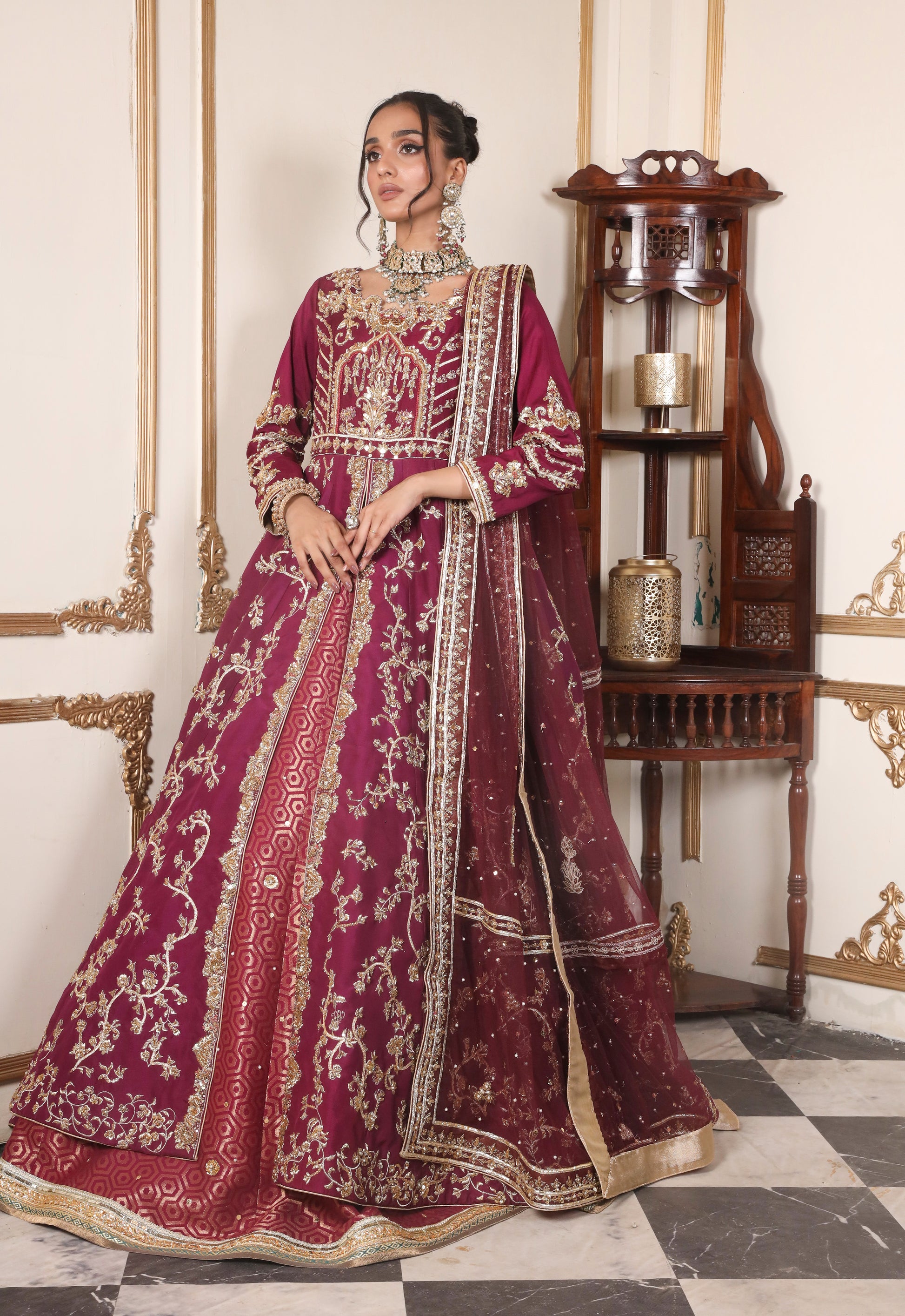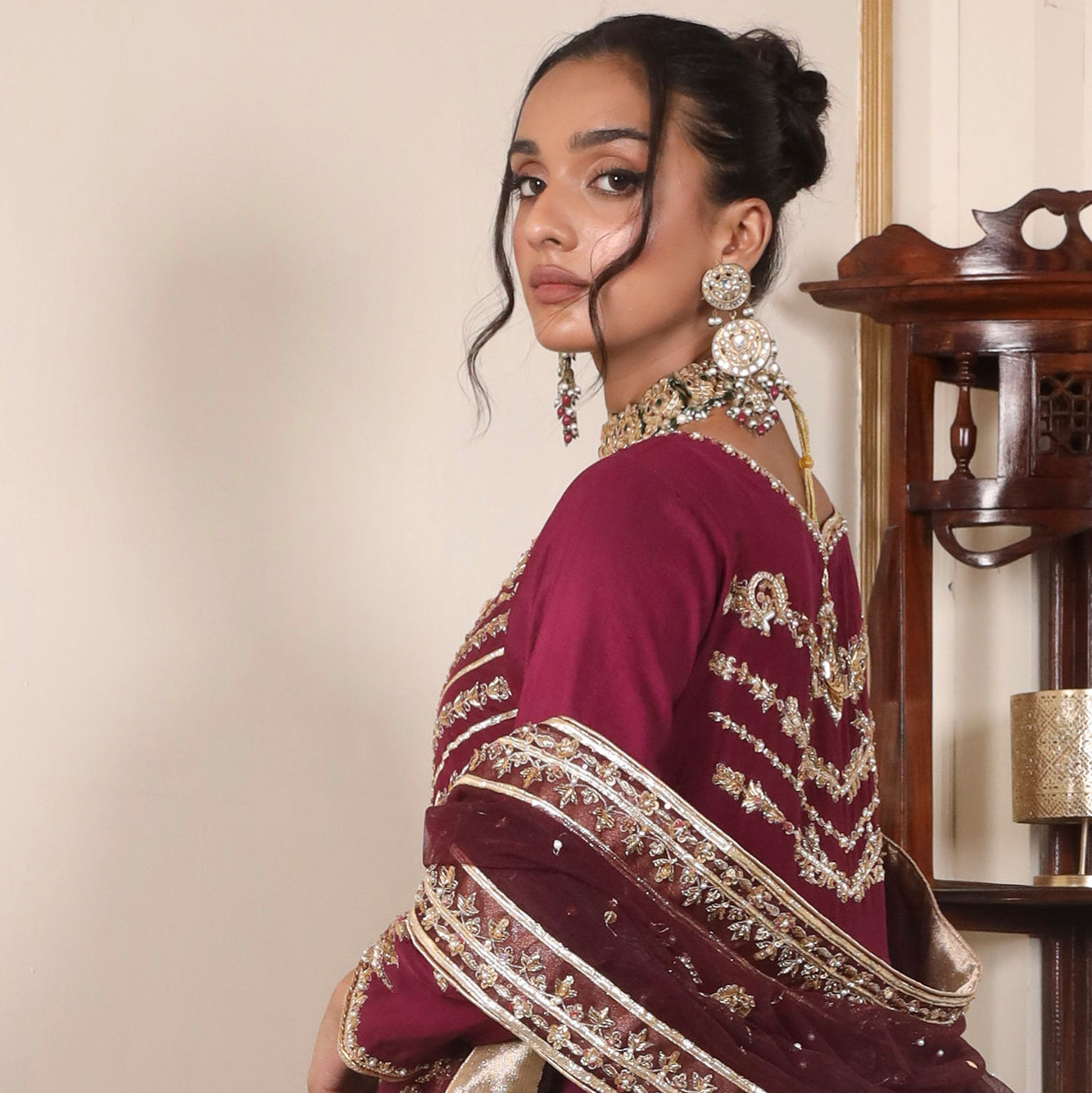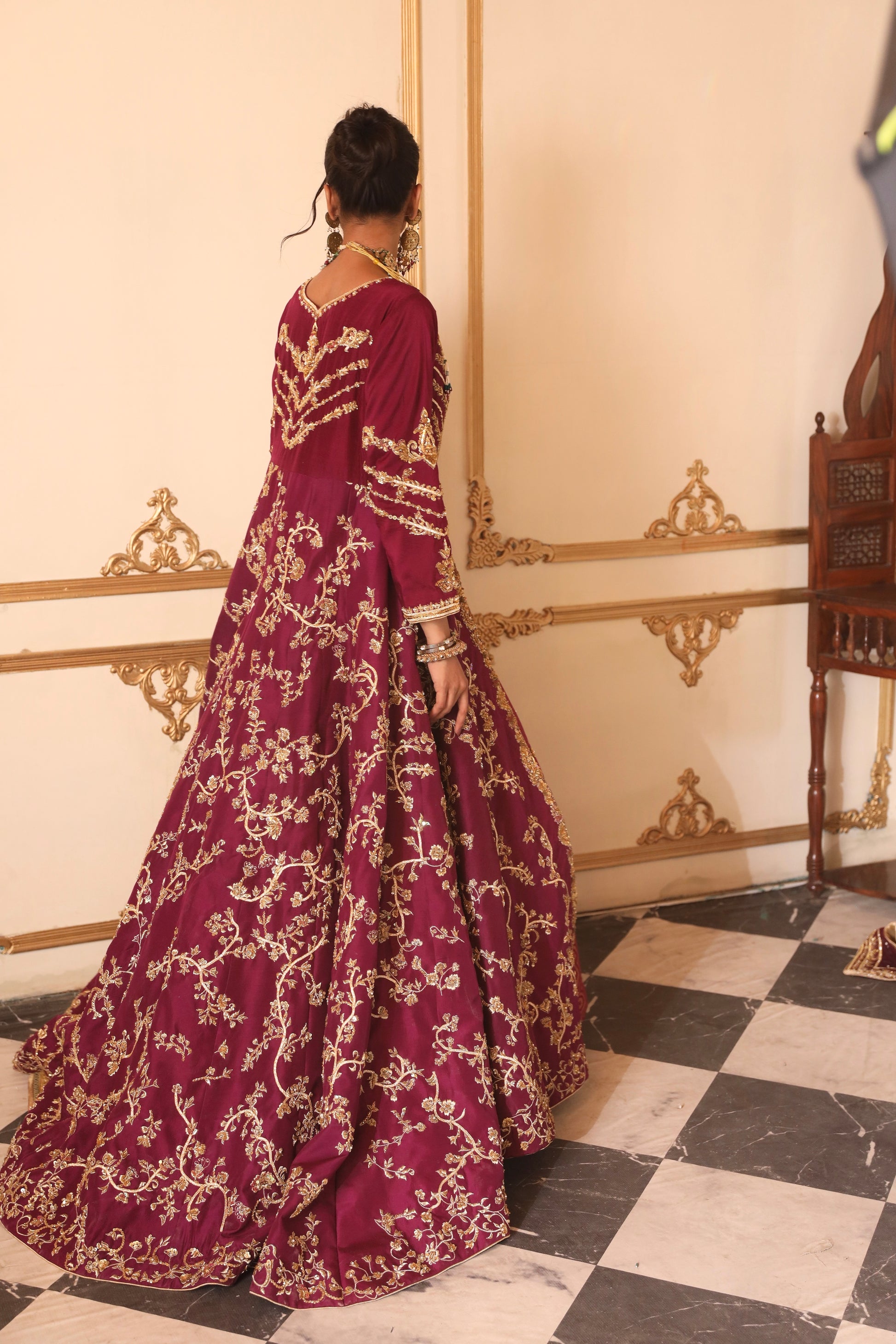 This extravagant bridal Gown has luxe zardoze work in gold reshum, zarri, dubka and stones. It has a heavily worked back as well with a dori tassel on the back neckline. It is paired with a net handmade dupatta worked pallus and borders.