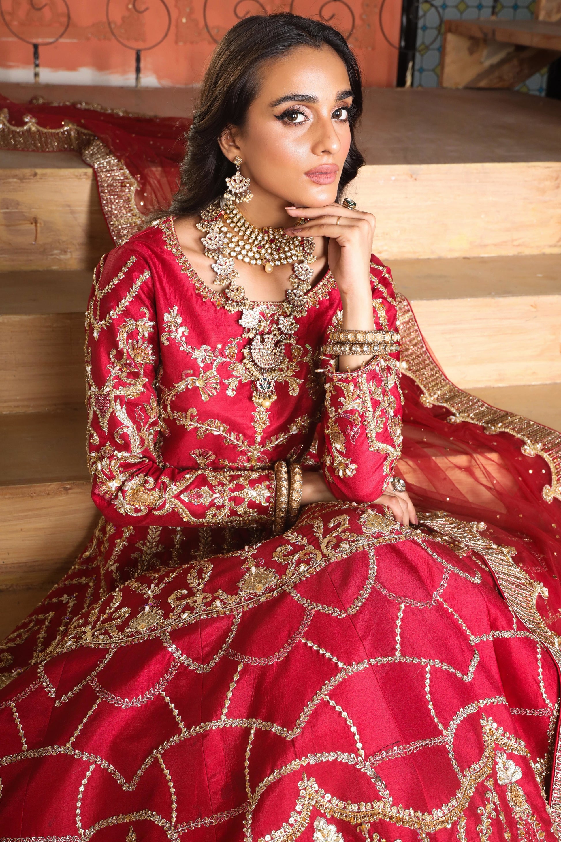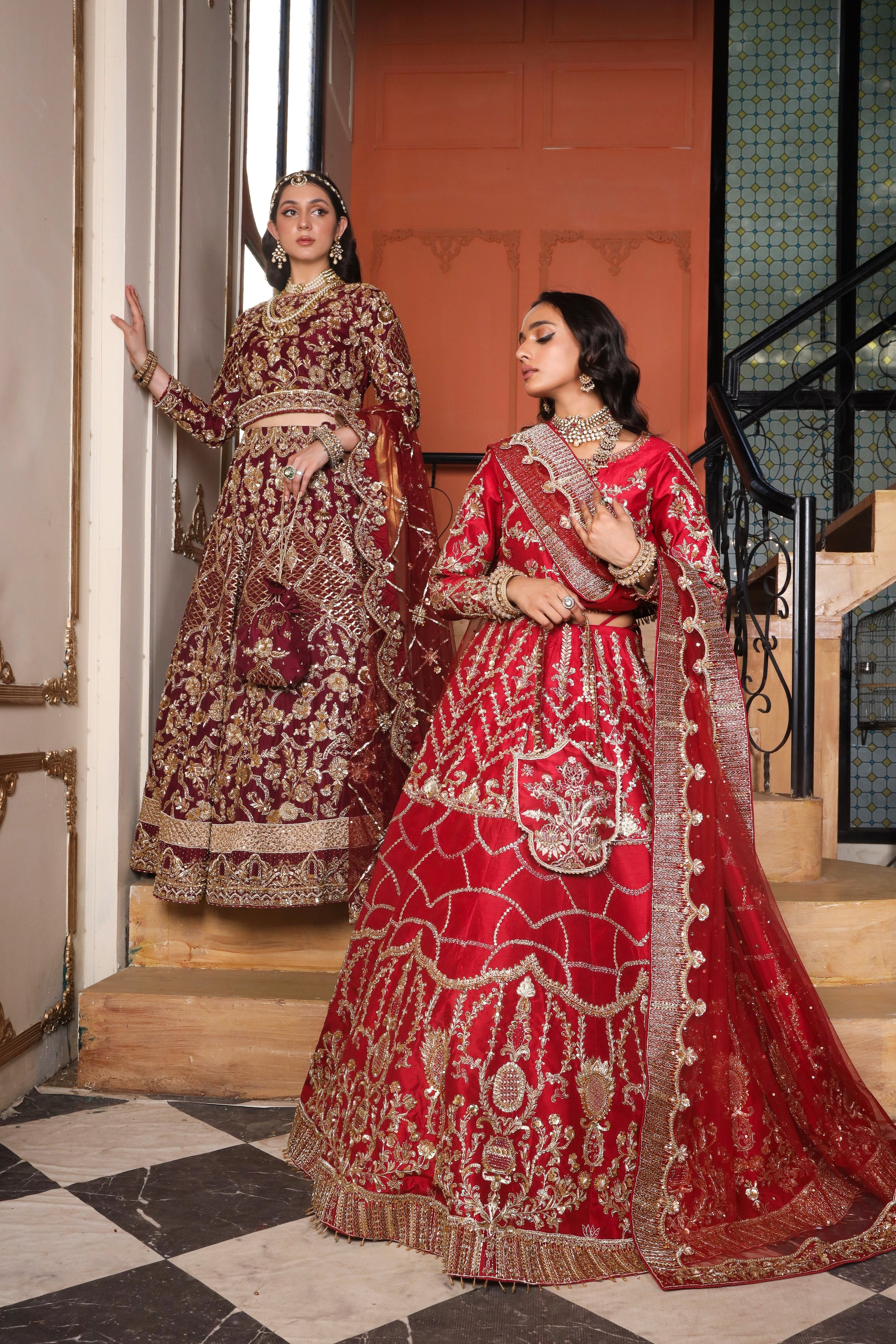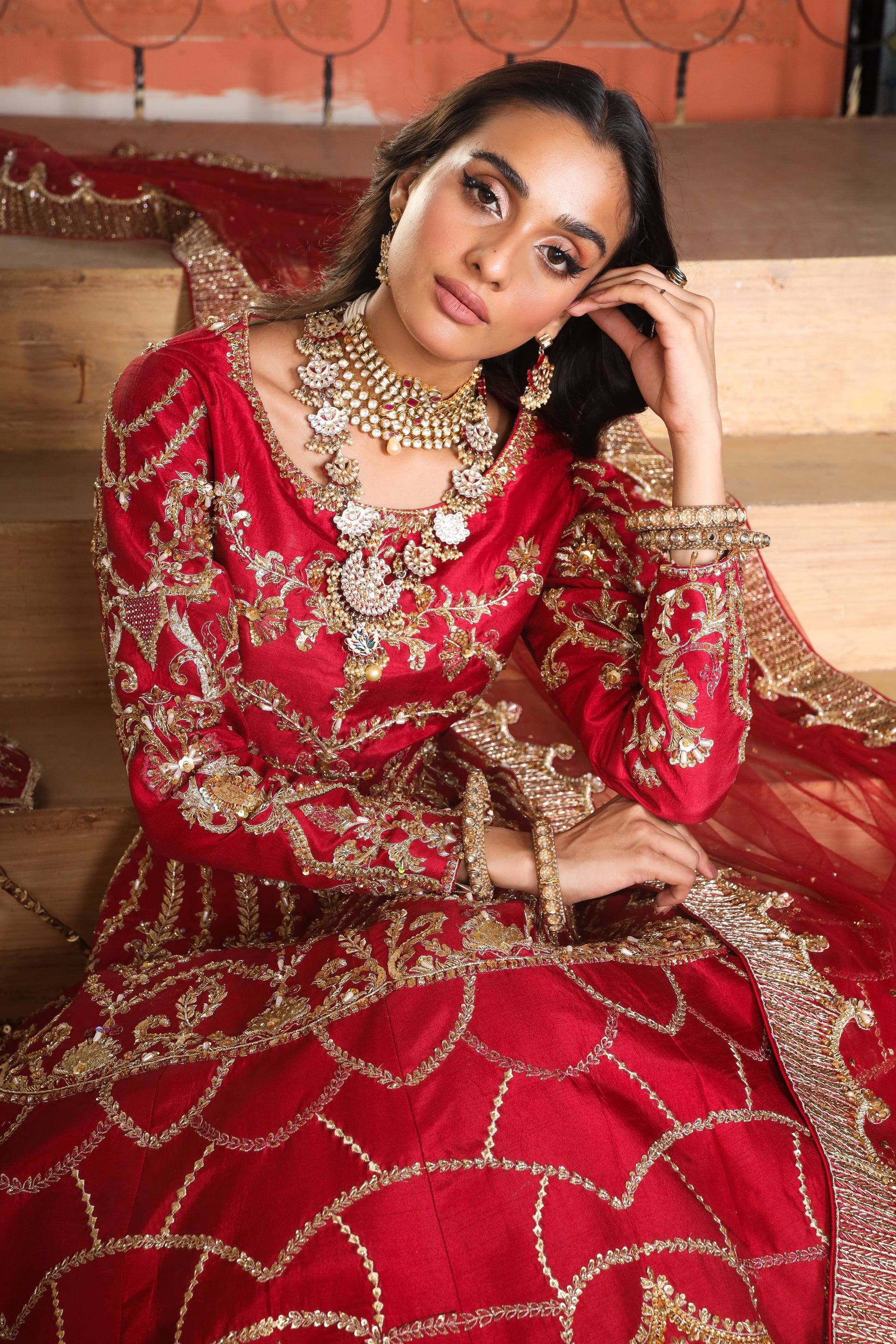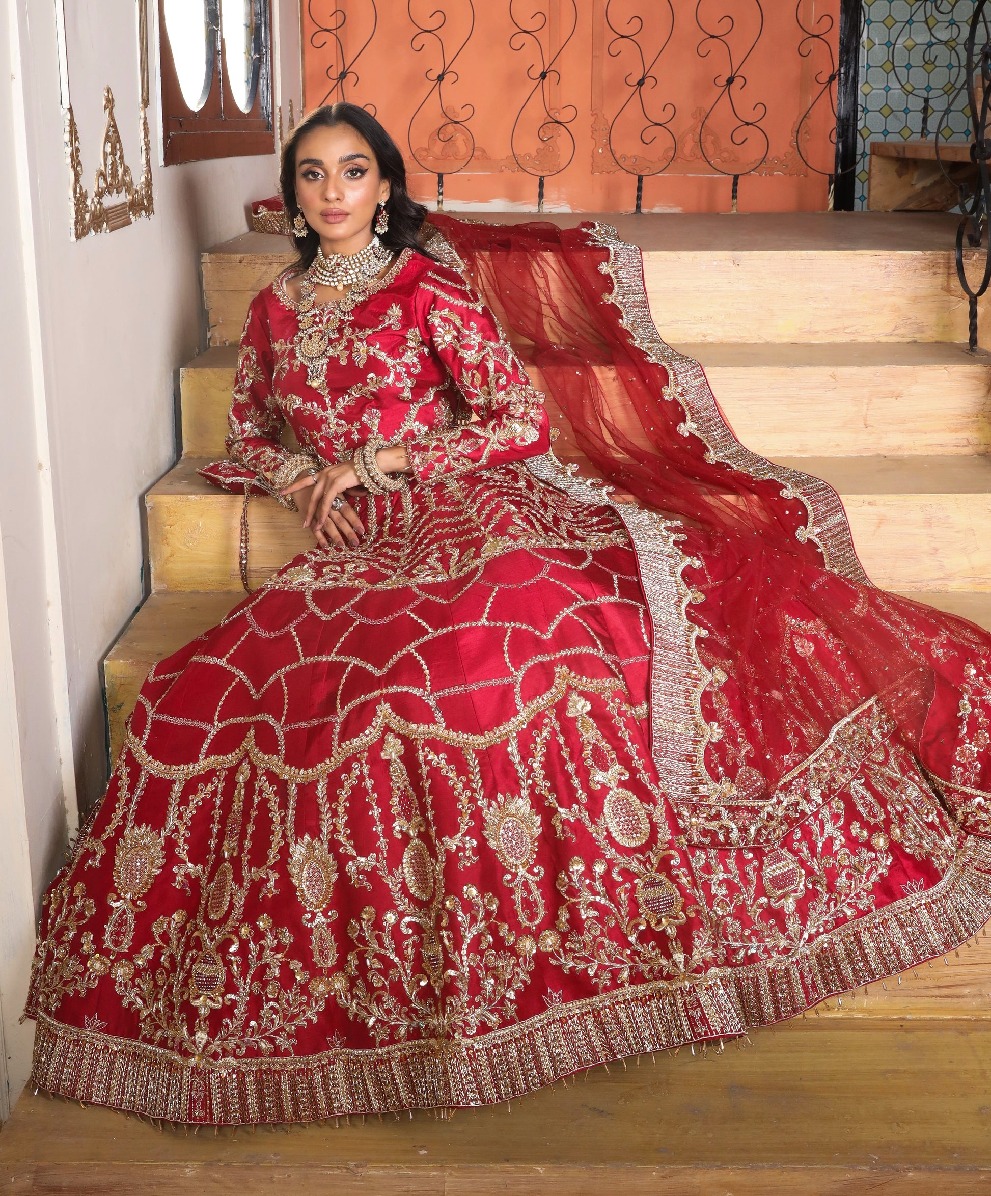 This outfit is completed with a net jaal dupatta with heavy geometric and floral pallus embellished borders and booti all over.